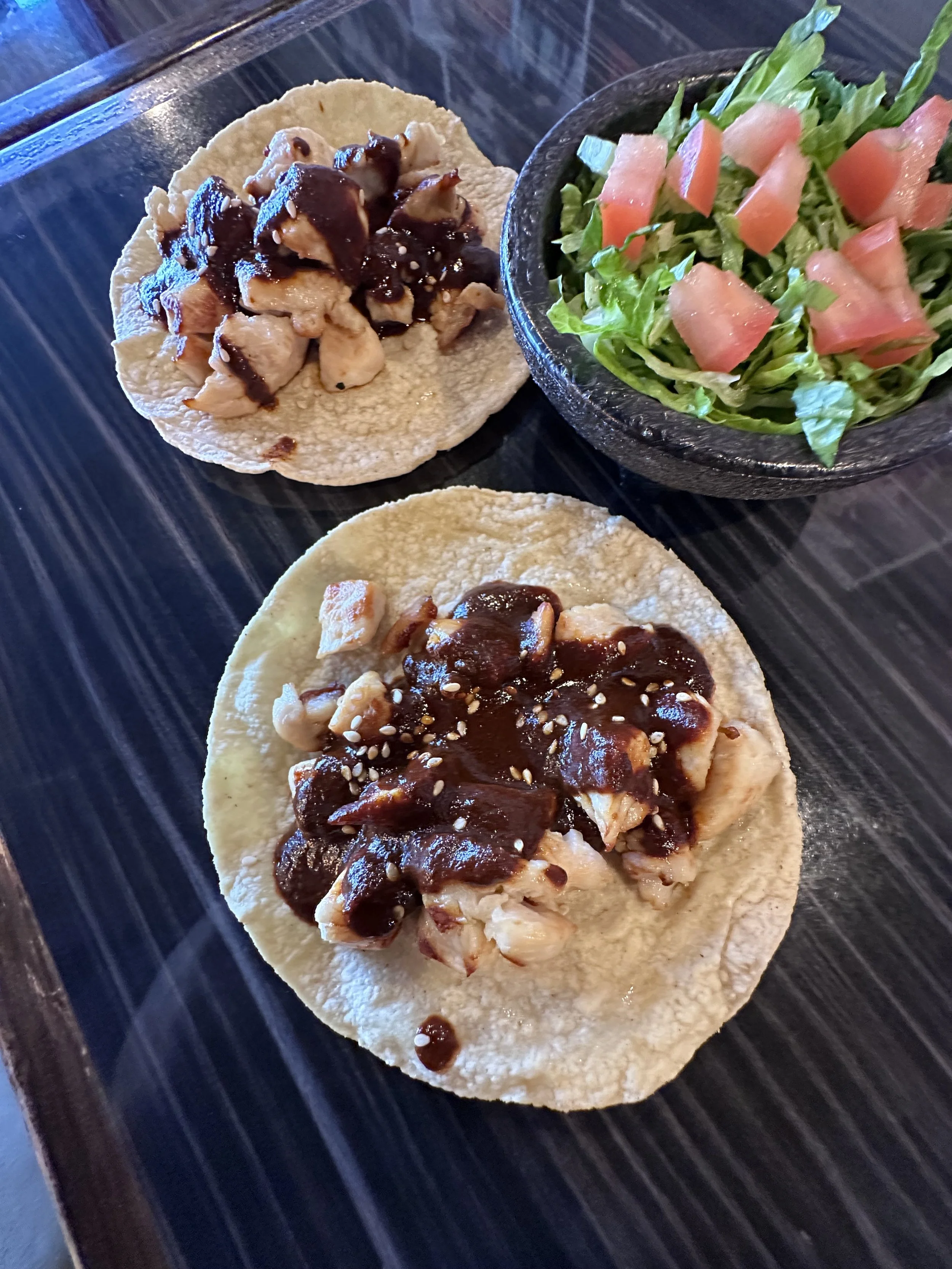 chopped chicken breast covered with authentic mole coloradito and sesame seeds served on corn tortillas. (gluten free)